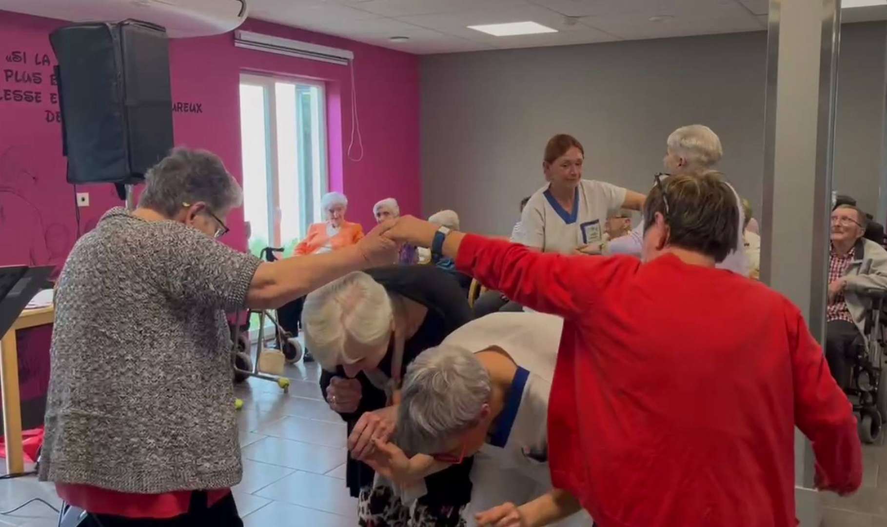 Dès les premiers refrains, des mains battent la mesure. Le couple enchaîne variétés françaises et morceaux années 60-70 que tout le monde fredonne encore. Dans l'allée centrale, deux soignantes invitent une résidente à esquisser quelques pas ; leurs bras levés dessinent un pont sous lequel se glissent rires et chignons argentés.