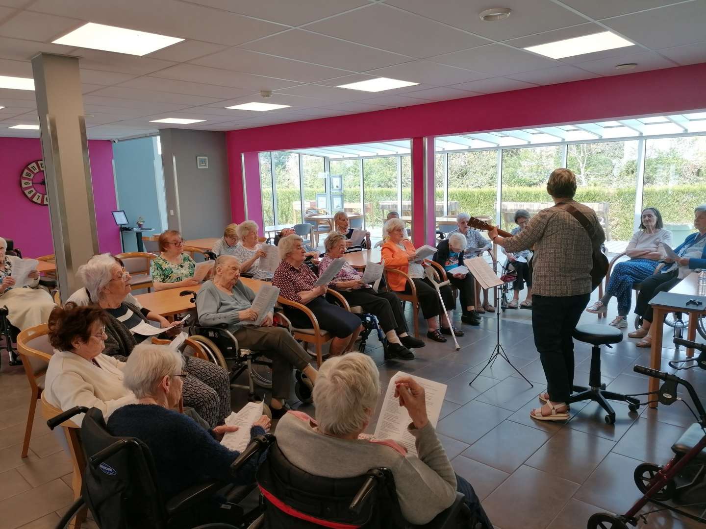 Mardi, une séance de chant collectif a rassemblé une trentaine de participants. Assis autour du musicien, chacun a suivi le livret de paroles pour reprendre des airs connus. Les objectifs étaient clairs : stimuler la mémoire des textes, travailler la respiration et créer un moment de partage calme.